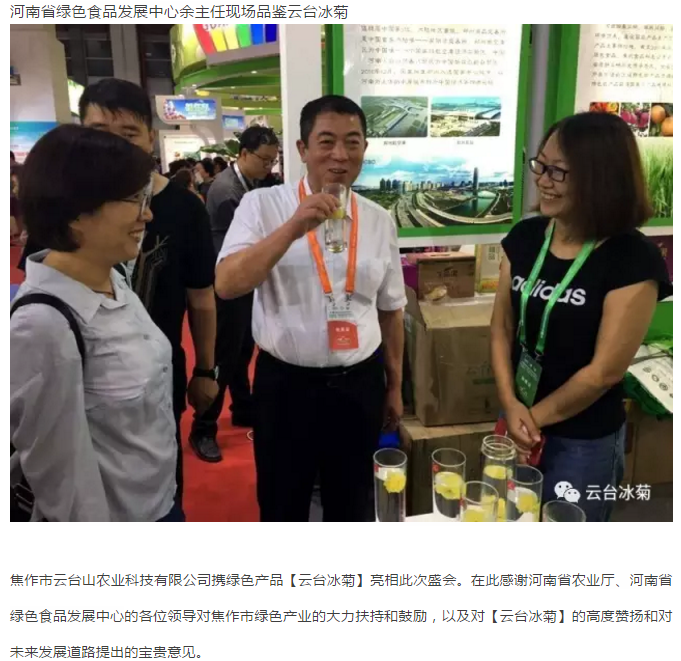 云臺冰菊不僅凸顯了河南綠色食品大家族、新發(fā)展和新形象,也為本屆博覽會“綠色理念、綠色生產(chǎn)、綠色消費”主題貢獻了一己之力,受到蒞會領(lǐng)導、廣大市民、國內(nèi)外客商和各類媒體的廣泛關(guān)注和高度稱贊。